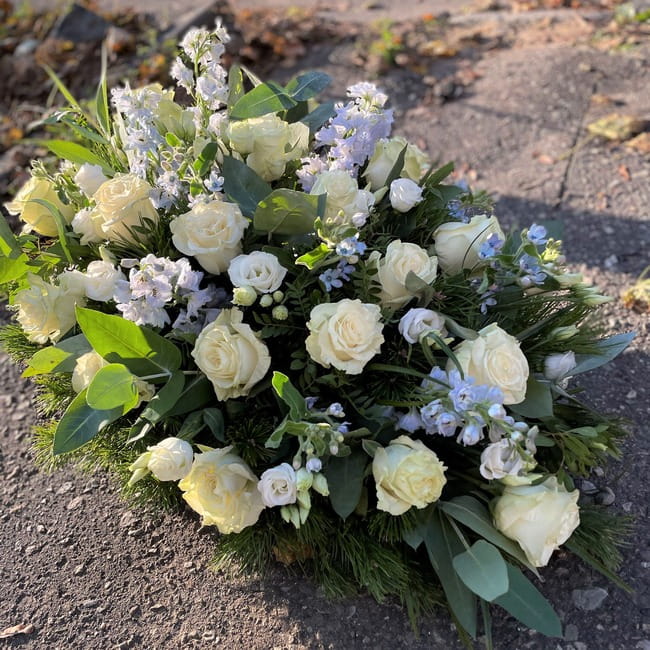 Kremowe róże w białej wiązance pogrzebowej symbolizują nadzieję na to, że zmarła osoba jest już z lepszym miejscu. Śnieżnobiałe eustomy i lewkonie dodają kompozycji niezwykłej lekkości, a błękitne oxypetalum wprowadza delikatną harmonię. Ta idealnie skomponowana wiązanka pogrzebowa będzie nie tylko przepięknym wyrazem szacunku do zmarłego. Za jej pomocą wyrazisz też najszczersze współczucie dla pogrążonej w smutku najbliższej rodziny.