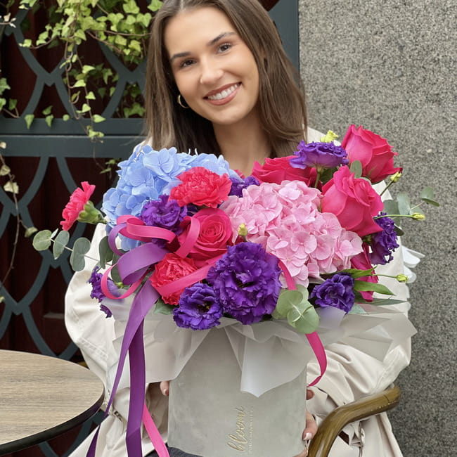 Kolorowy flower box z hortensją i różą to radosna kompozycja, która błyskawicznie wywoła uśmiech na twarzy adresatki. Fuksjowe róże połączyliśmy z okazałymi kwiatami hortensji. Błękitna i jasnoróżowa hortensja wspaniale komponują się z ciemnofioletowymi eustomami. Siłą tego bukietu w pudełku są intensywne kolory pąków. Obok tak pięknych kwiatów nikt nie przejdzie obojętnie.
