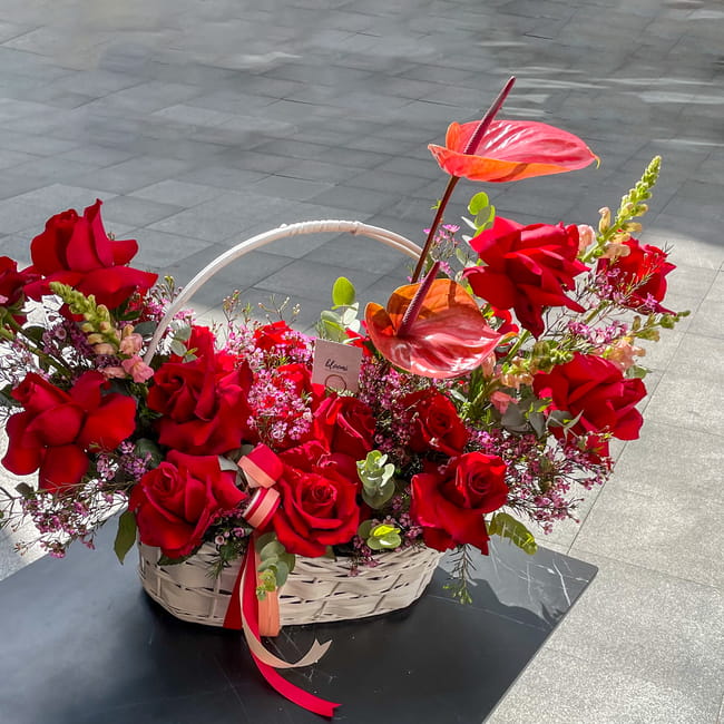 Wybierz kompozycja czerwonych kwiatów w koszu, aby zaskoczyć swoją ukochaną w Dniu Świętego Walentego. Z pewnością zachwycą ją okazałe czerwone róże i anturium o intrygującym wybarwieniu. Drobne różowe kwiatki i lwie paszcze dodają kompozycji radosnego charakteru. A zielone listki eukaliptusa, kontrastując z czerwienią róż, podkreślają ich intensywną, głęboką barwę.