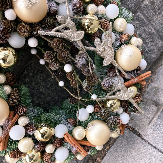 Wianek świąteczny z mnóstwem złotych i białych bombek i figurkami tańczącej baletnicy to piękna dekoracja, w której uchwycony został radosny nastrój świąt. Szyszki i laseczki cynamonu ocieplają kolorystykę całej kompozycji. A zielone gałązki jodły nobilis są trwałą podstawą spajającą świąteczną ozdobę.