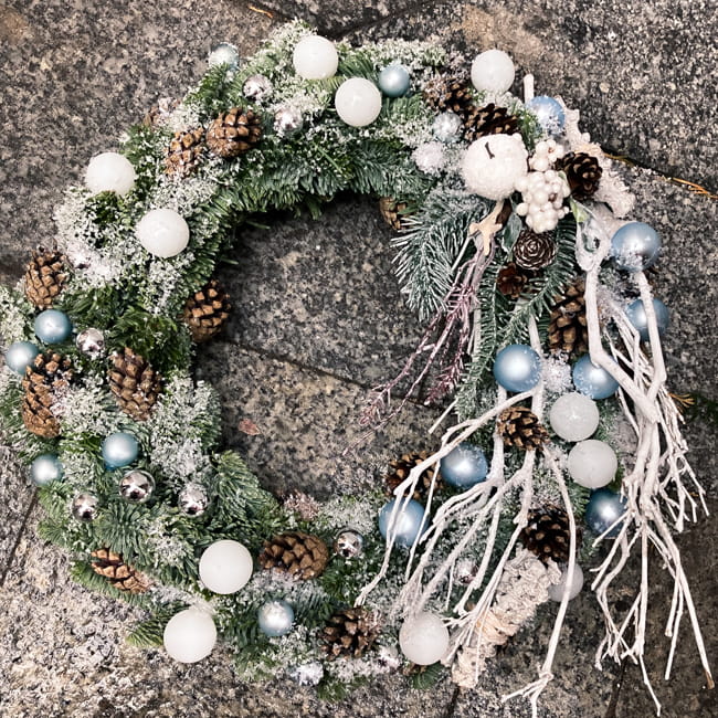 • Poproś o wkomponowanie dodatków florystycznych, takich jak bombki, świece, figurki lub o oprószenie stroika sztucznym śniegiem.