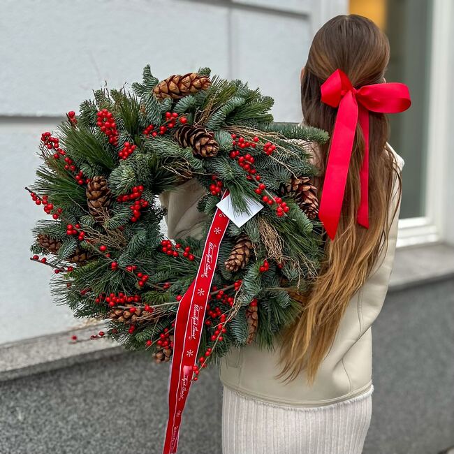 Przepiękny bożonarodzeniowy wianek na drzwi to ozdoba, która pomoże Ci stworzyć magiczny nastrój Gwiazdki. Drobne czerwone owocki i brązowe szyszki cudownie komponują się ze szlachetnymi gałązkami jodły. A dekoracyjna wstęga z życzeniami dodaje wiankowi wytwornego charakteru. Wianek zbudowaliśmy na bazie jodły nobilis. To wyjątkowa roślina, która nie gubi igieł. Zamiast tego, cieszy zachwycającym wyglądem i zapachem przez długi czas.