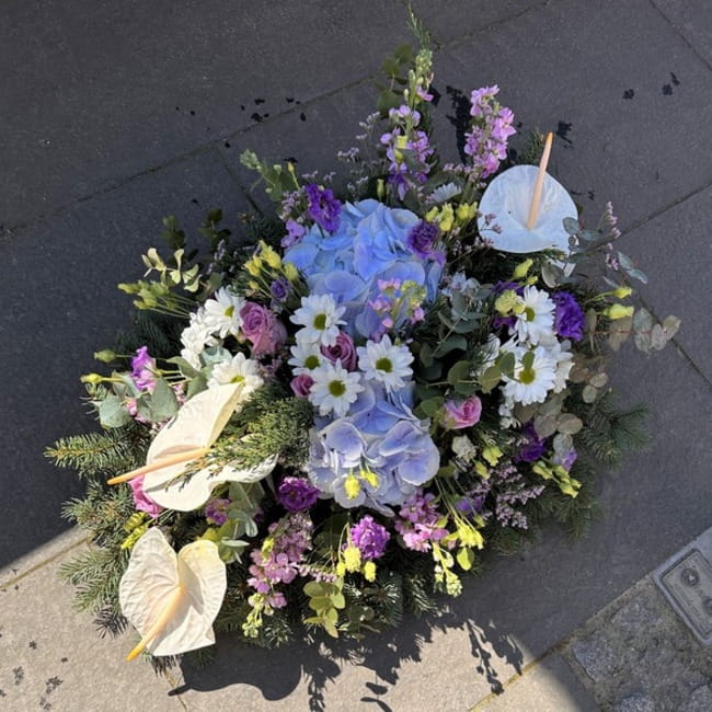Wiązanka pogrzebowa z błękitną hortensją będzie pięknym wyrazem smutku przenikającego wszystkich uczestników pogrzebu. Śnieżnobiałe anturium, symbol niewinności, połączyliśmy z błękitnymi hortensjami - chłodnym spokojem. Fioletowe eustomy i alstromerie sprawiają, że całość wygląda niezwykle elegancko i pomoże podkreślić podniosły nastrój uroczystości ostatniego pożegnania. Dodatki w różnych odcieniach zieleni: eukaliptus i eustoma dodają kompozycji niezwykłej lekkości.