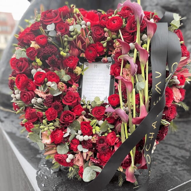 Wyjątkowo piękny wieniec pogrzebowy z róż pomoże Ci w godny sposób pożegnać ukochaną osobę. Okazałe pąki róż połączyliśmy z bordowymi chryzantemami intensywnie czerwonymi goździkami.Jasno różowe eustomy rozjaśniają kompozycję, a eleganckie, smukłe kalie podkreślają smutną powagę uroczystości pogrzebowej.