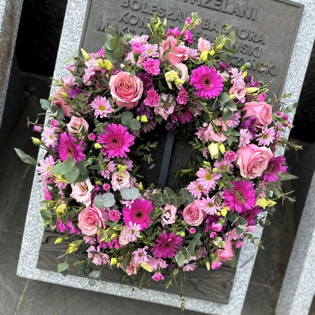 Wybierz różowy wieniec pogrzebowy, gdy idziesz na pogrzeb kobiety - koleżanki, cioci, znajomej z pracy. Piękne kwiaty będą doskonałym symbolem żalu po jej śmierci. Pamiętaj, aby dołączyć szarfę z kondolencjami. W ten sposób podkreślisz łączącą Was więź i przyjaźń.